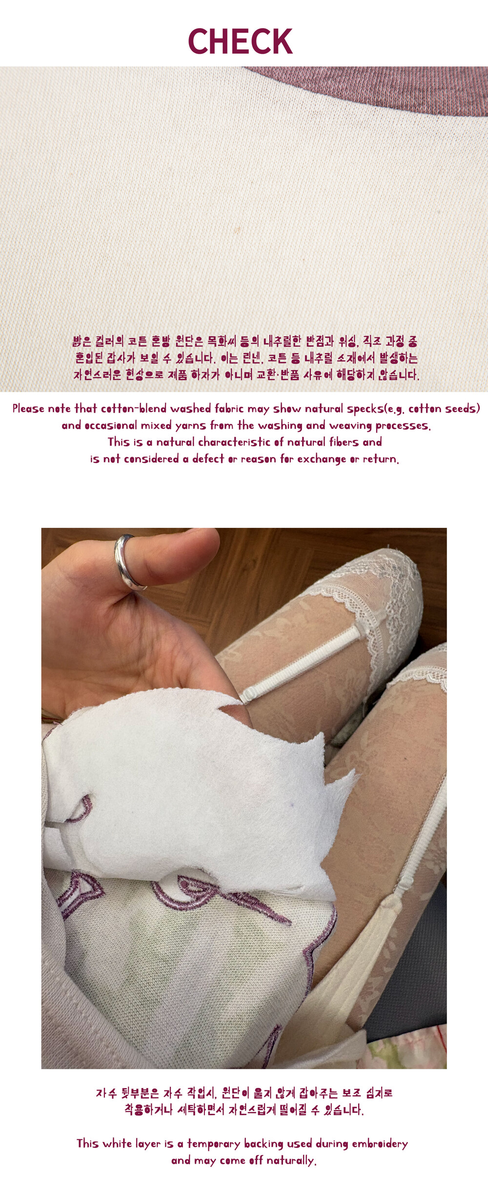 · 잡사(다른 실 혼입)는 코튼, 린넨 등 내추럴 소재 특성상 발생할 수 있으며, 착용에 영향을 주지 않는 경우 불량에 해당하지 않습니다.